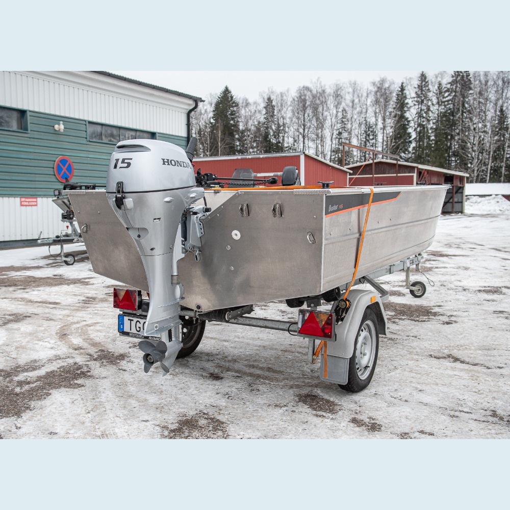 Oanvänd båt från 2022 i nyskick! Med Honda BF15 från 2019 med elstart och lång rigg. Sservades senast 2024 då ca 55h, efter det inte använts mer än provstartats, servicedokumentation finns.